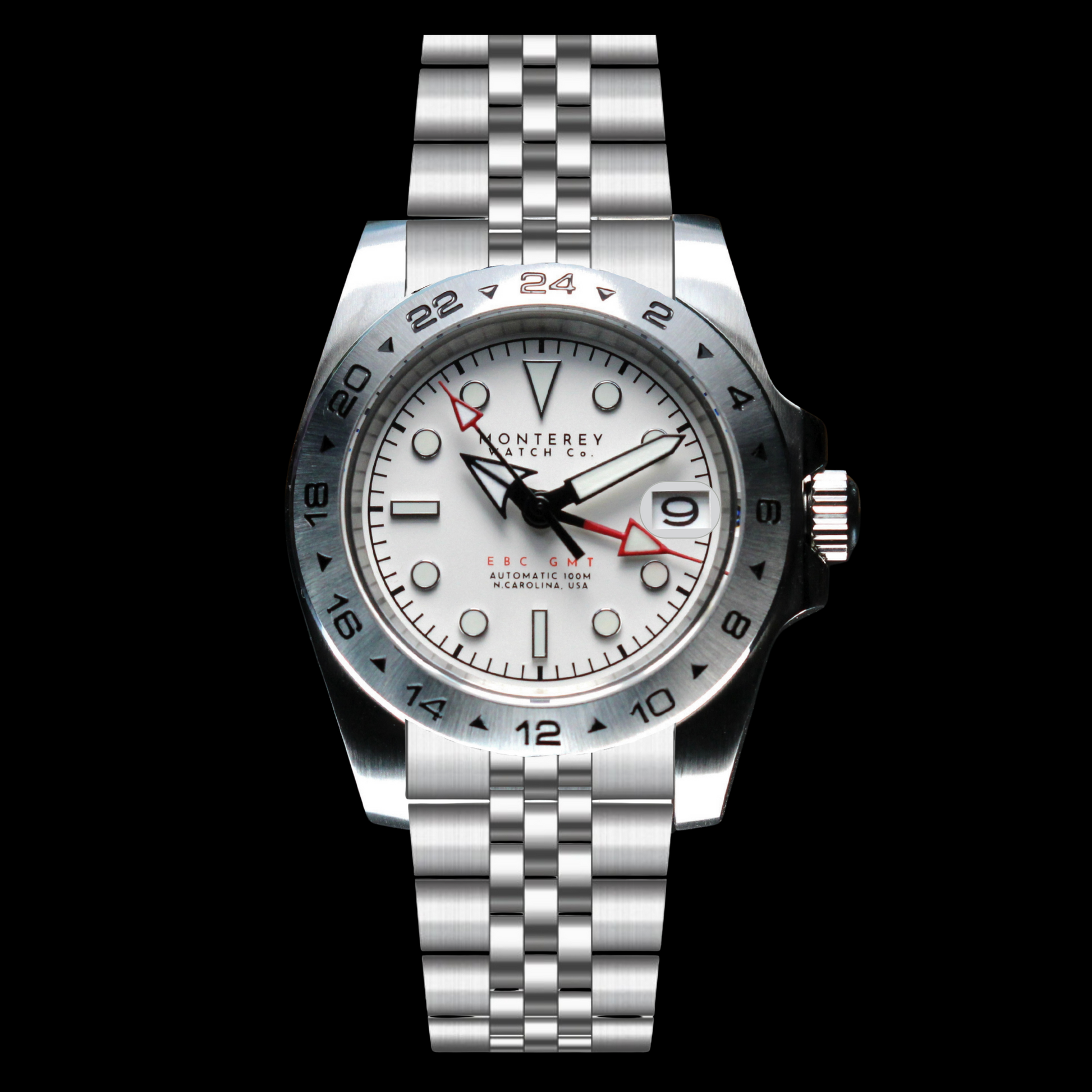 The EBC GMT is a really nicely done homage, but with its own distinctive features. This is my 5th white dial watch, and I have to compliment the Monterey team on the arctic white dial. It has an unusually dynamic color palette; a clean white in good light conditions, and a sandy/bronze like hue that can transition to an almost sunset-like pale reddish hue in other/dimmer light. Quite interesting. I am a big fan of the handset (and the red GMT and second hands stand out clearly). I also appreciate the dual color scheme with the lime (blue on GMT and seconds, green elsewhere). The lume is not as vibrant as one might expect, but all-in-all, a really nicely done watch!