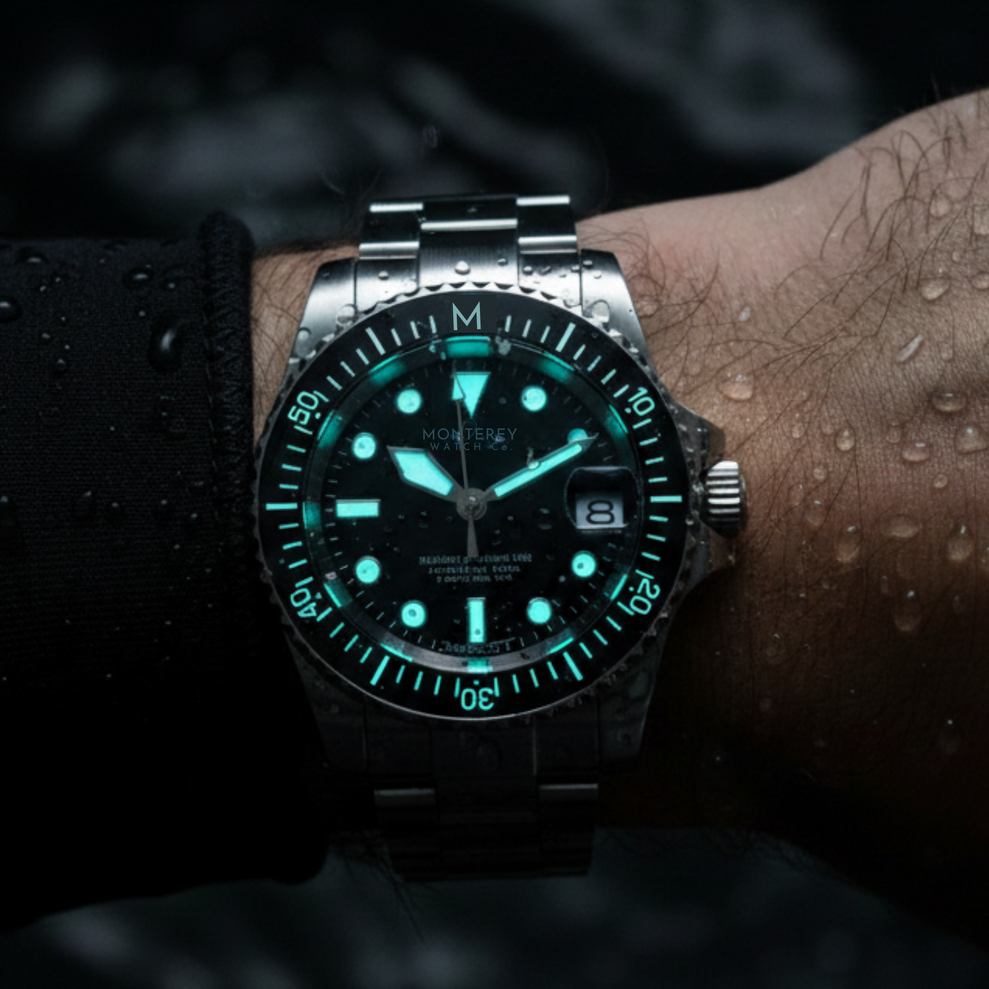 Both feature BGW9 Super-LumiNova that glows bright blue in low-light conditions—whether you're 100 meters down or checking the time at 3 AM. The lume application on the indices and hands is generous, bold, and built for actual use.