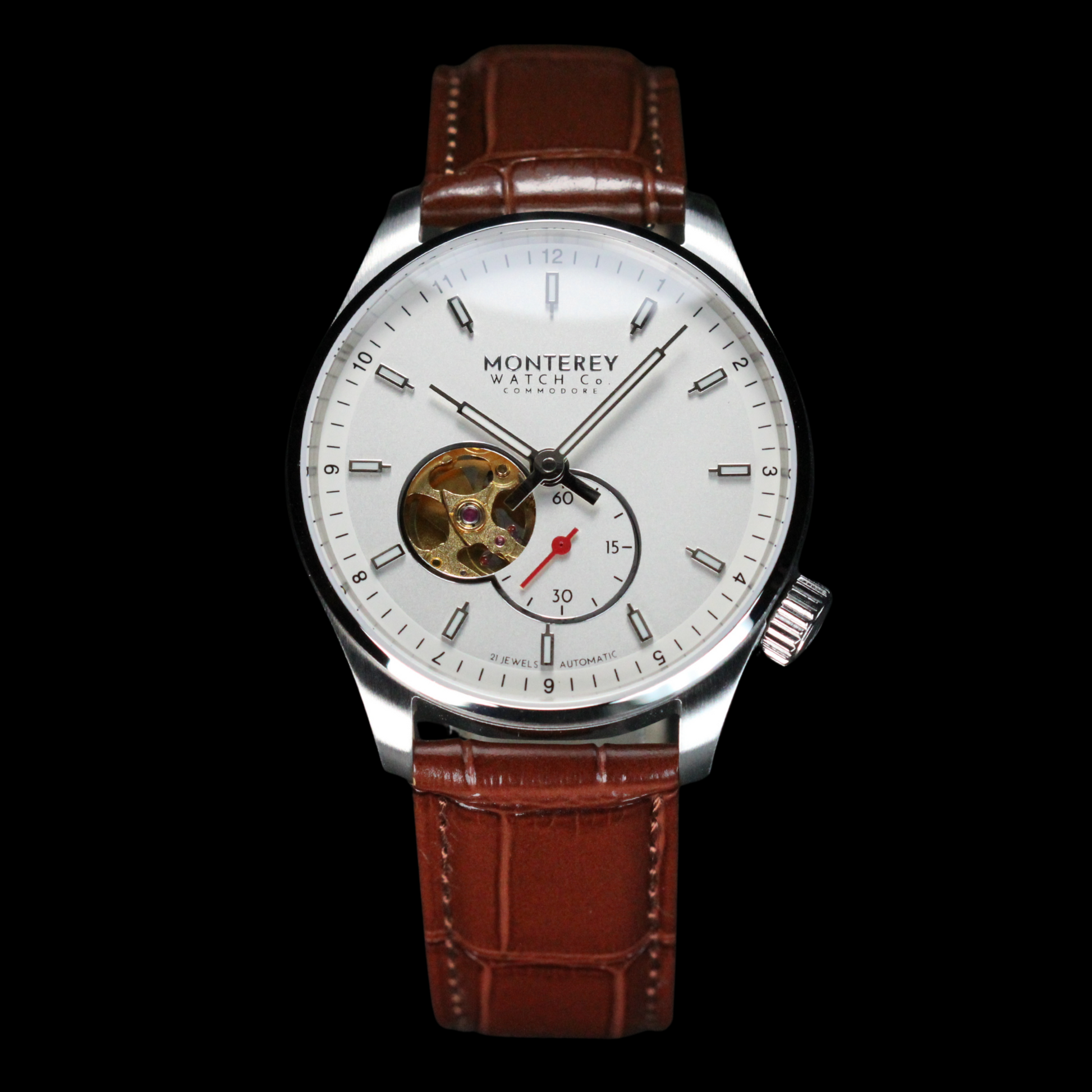 Flip the watch over to reveal the display case back, offering an unhindered view of the finely crafted movement, complete with the Monterey logo elegantly etched onto the rotor. Encased in a polished 40mm 316L steel case, and available with a crisp white dial on a brown leather strap or a sleek black dial on a black leather strap, this timepiece blends classic sophistication with outstanding mechanical performance. It's more than a watch; it's a testament to refined taste.