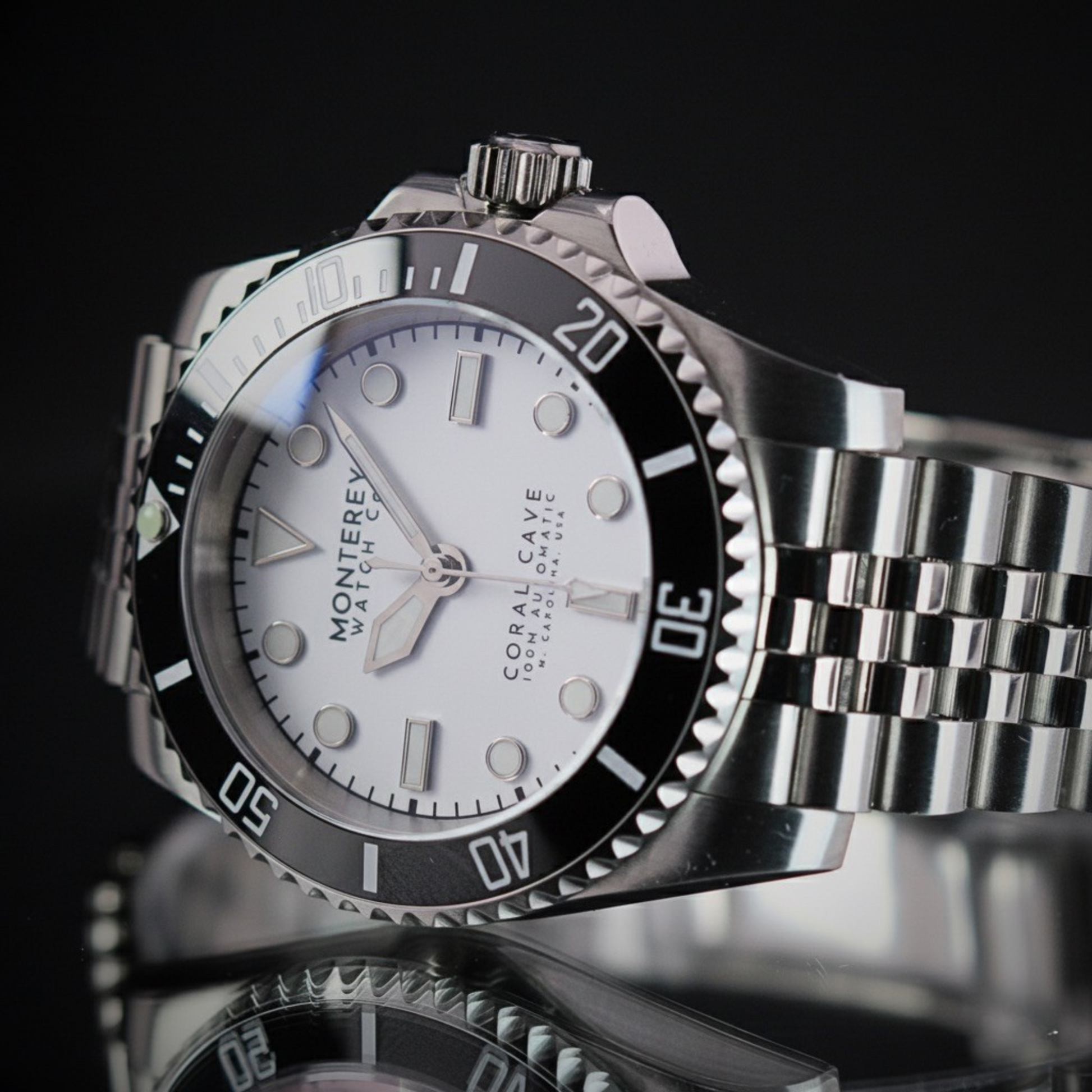 Introducing the Coral Cave diver, a new release that redefines the Monterey Watch Co. lineup. This timepiece challenges traditional conventions with its striking pink dial, a confident choice that speaks to a modern and versatile aesthetic. The absence of a date window creates a clean, focused design, prioritizing pure timekeeping.