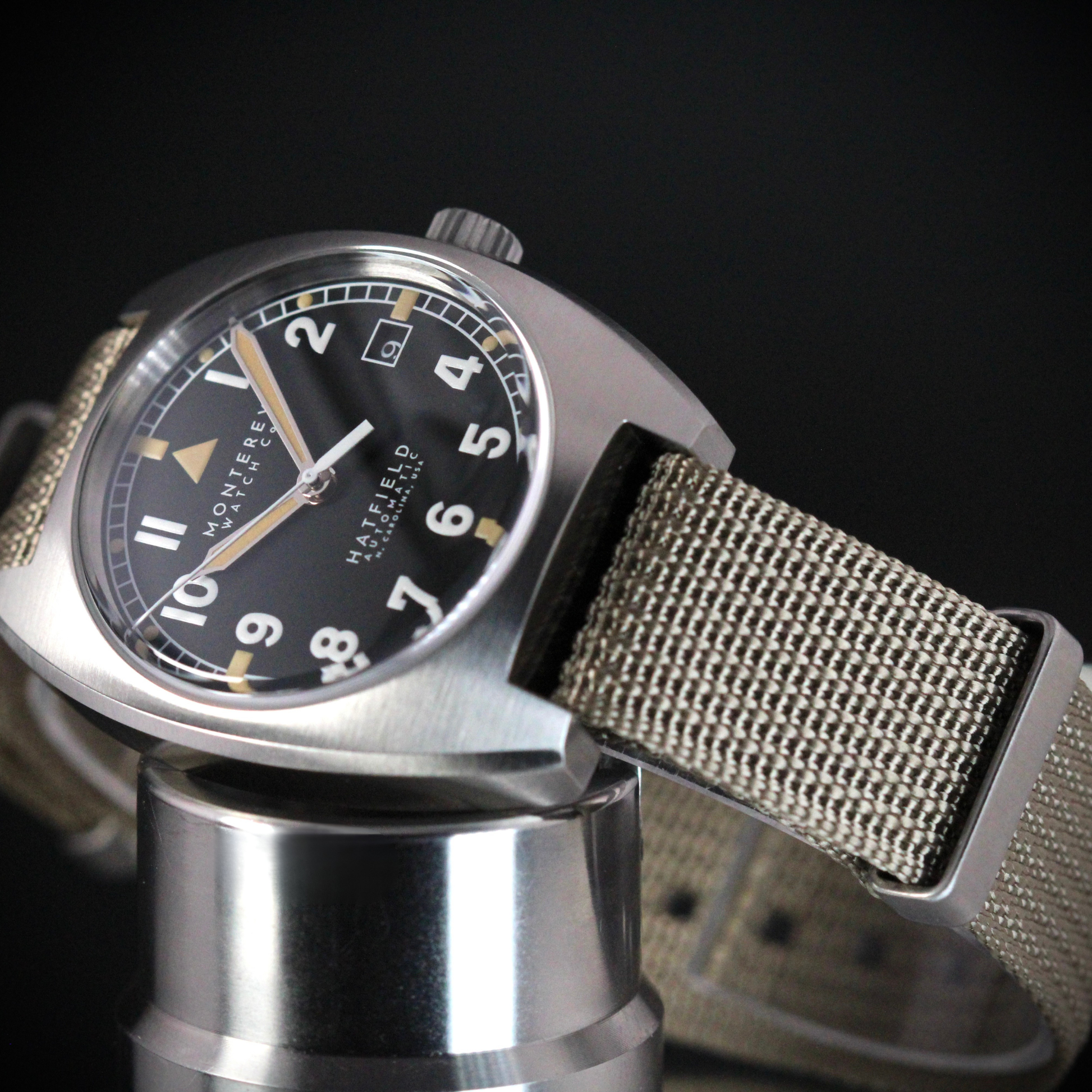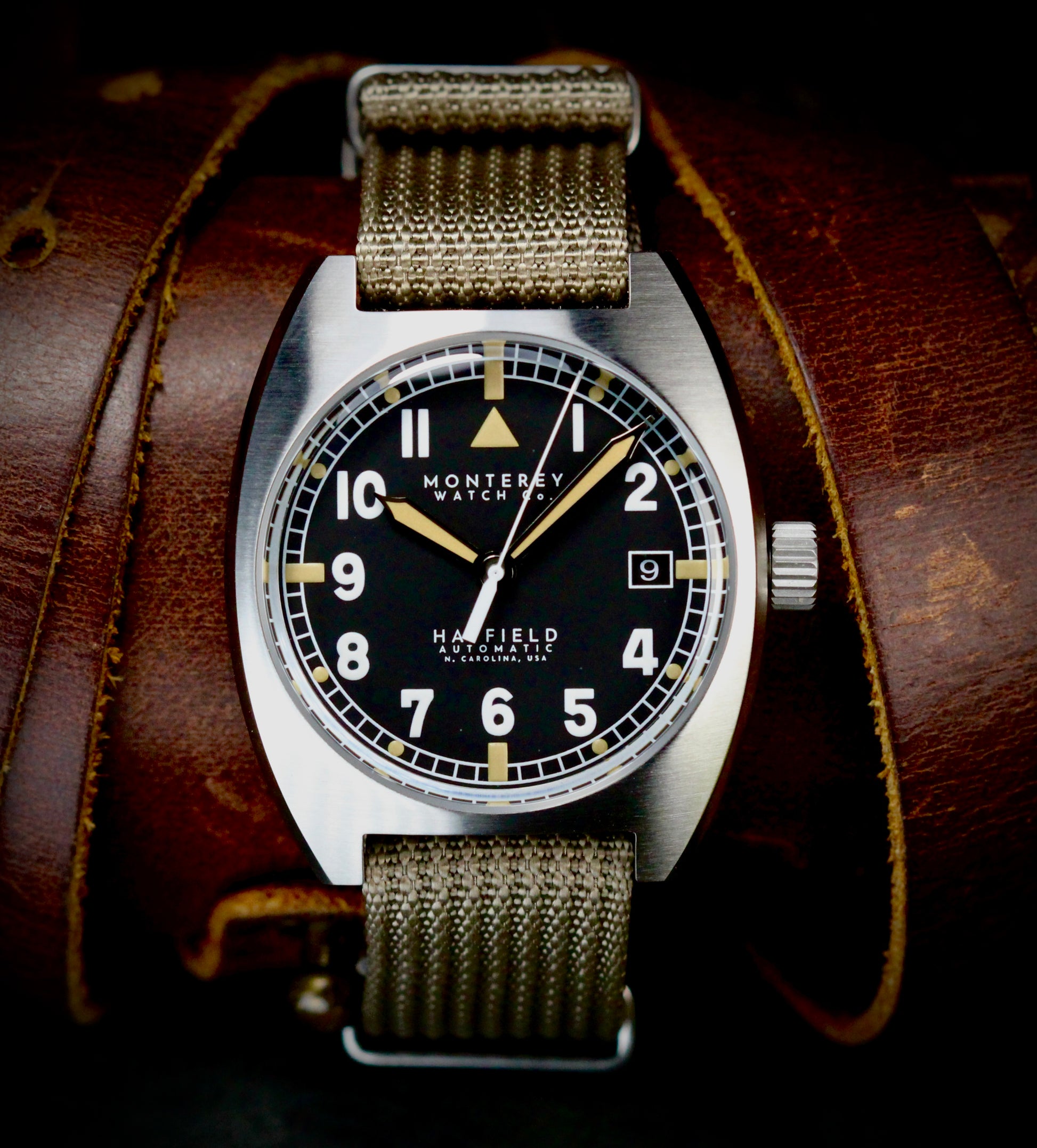 The Monterey Hatfield field watch embodies the timeless, rugged aesthetic popularized by classic military timepieces like the Hamilton Khaki Field. It features an elongated 36mm case with curved 18mm lugs, ensuring a comfortable fit for all-day wear.