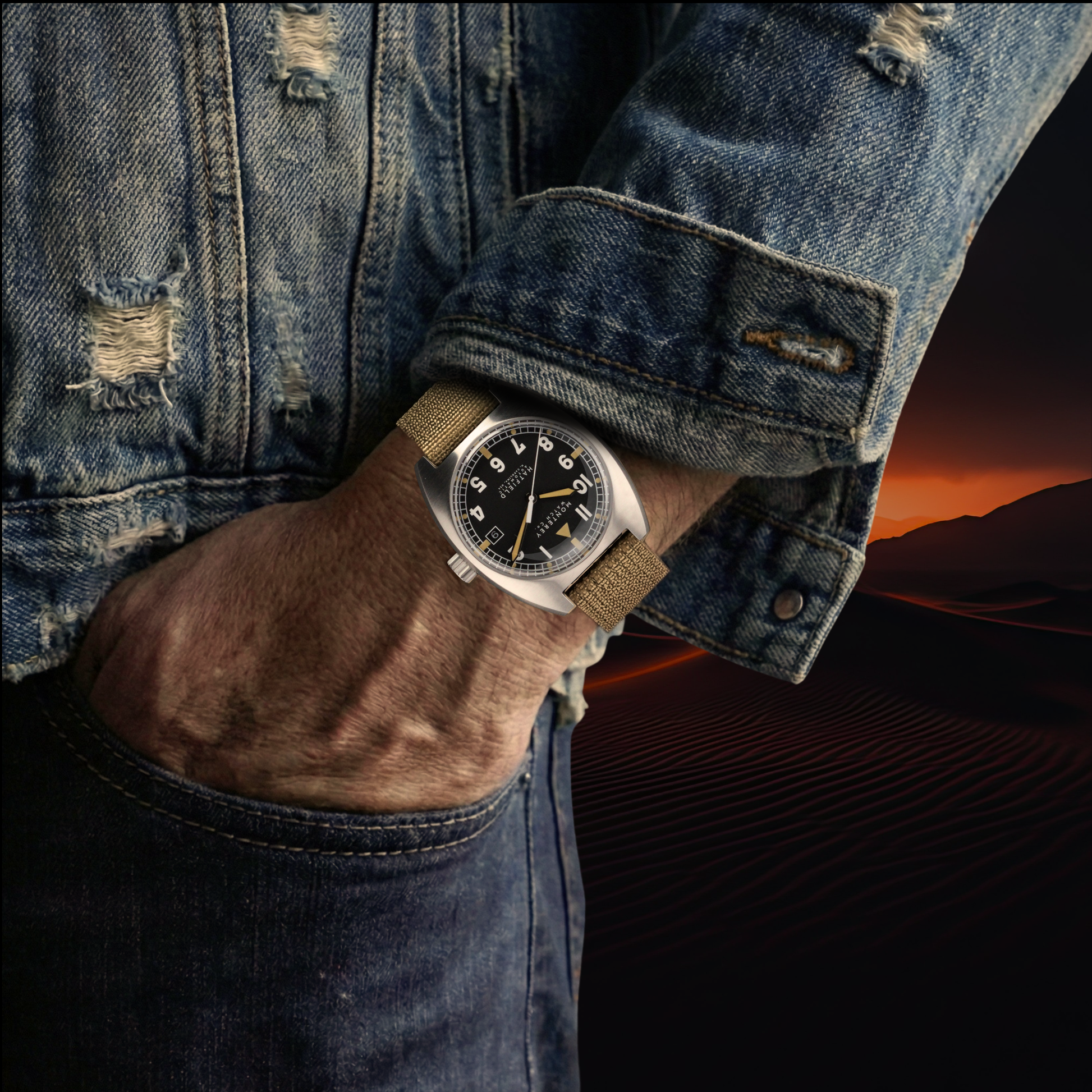 The Monterey Hatfield field watch embodies the timeless, rugged aesthetic popularized by classic military timepieces. It features an elongated 36mm case with curved 18mm lugs, ensuring a comfortable fit for all-day wear—perfect for the modern adventurer.